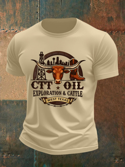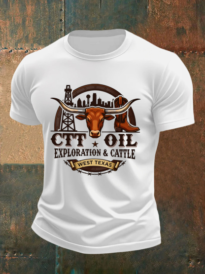 Men's Retro CTT Oil Exploration & Cattle Print Casual Tee