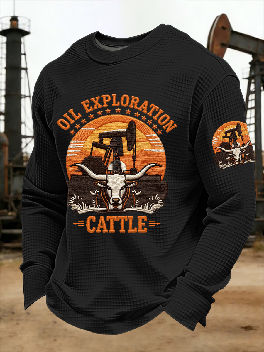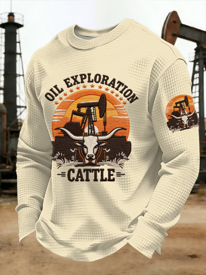 Men's Retro CTT Oil Exploration & Cattle Print Casual Waffle Long Sleeve T-Shirt