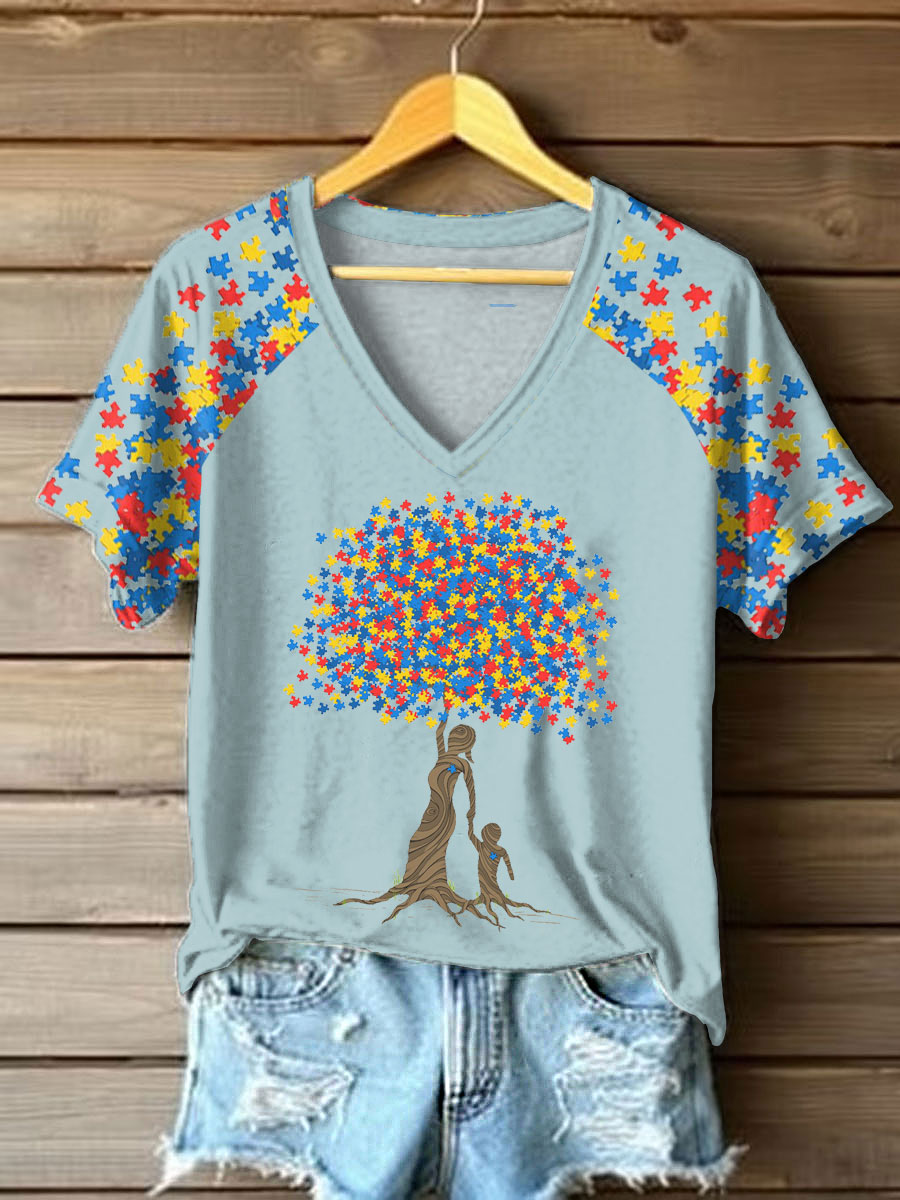 Women's Autism Awareness V-neck off-shoulder short-sleeved T-shirt