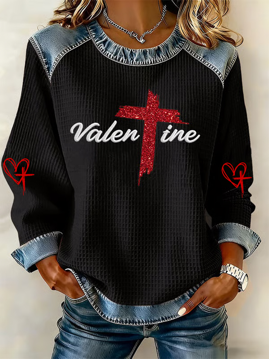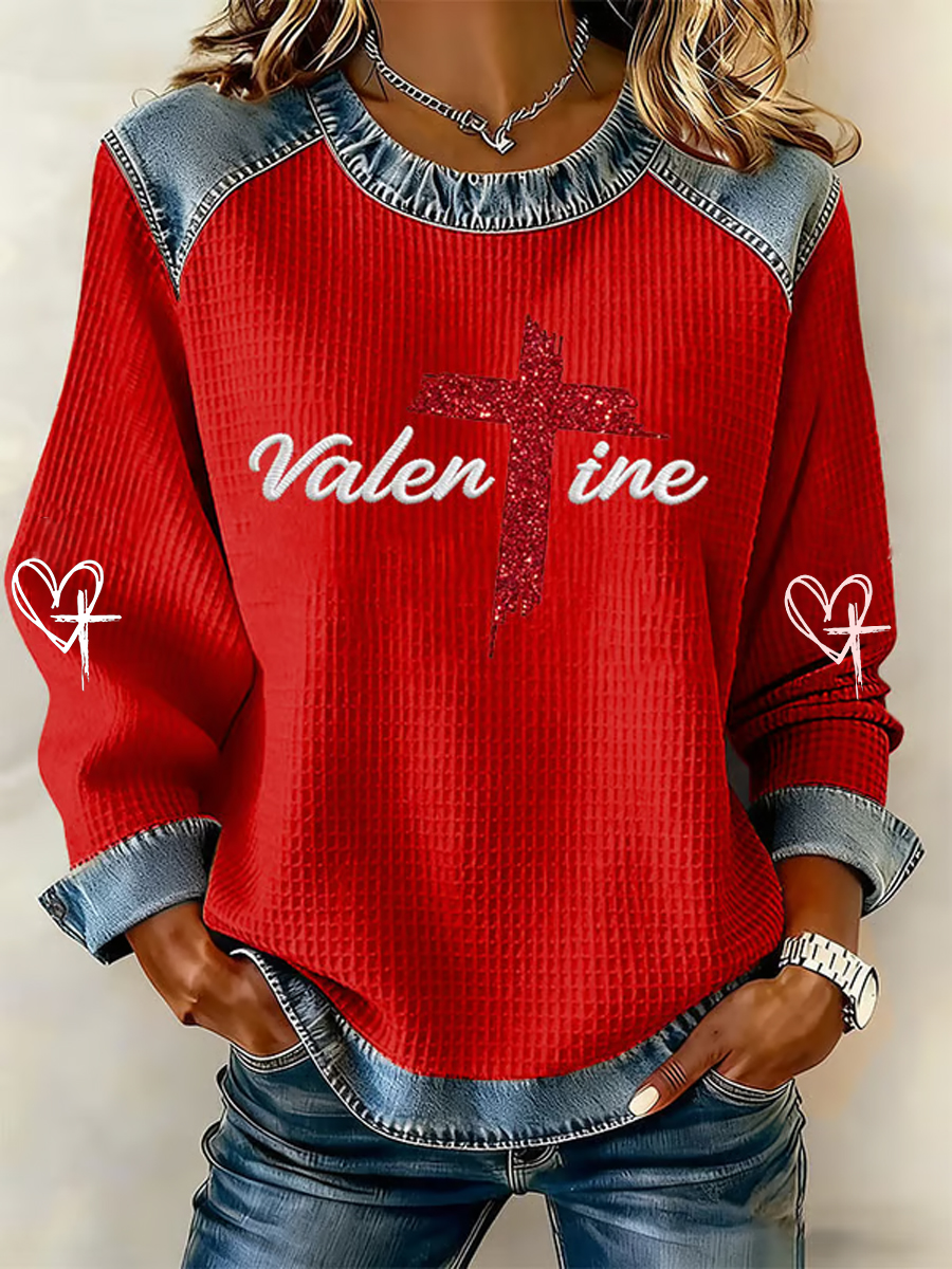 Women's Valentine's Day Faith Cross Print Denim Patchwork Top