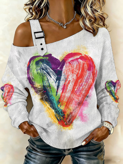 Women's Valentine's Day Retro Oil Painting Love Heart Print Casual Off-Shoulder Top